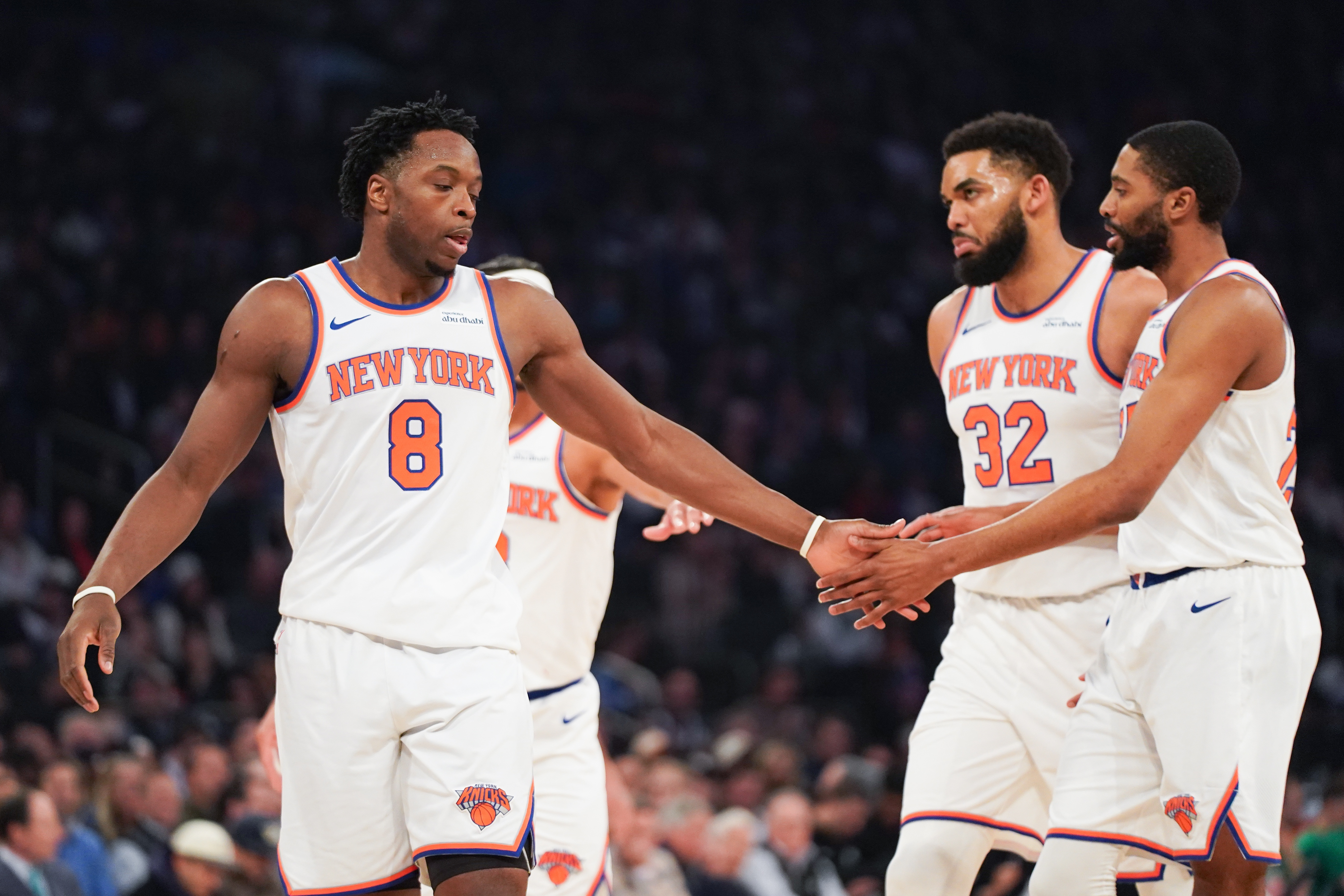 主场作战的尼克斯队常规赛的战绩是五十三胜二十九负,球队最终排在了东部第三的位置,他们和绿军落在了一个半区。在季后赛首个主场比赛中,尼克斯队以113比102击败了老鹰队,拿下季后赛的开门红。此役,尼克斯队的首发五人均得分上双,球队核心布伦森轰下了28分5篮板7助攻的数据,唐斯则是贡献了25分8篮板。