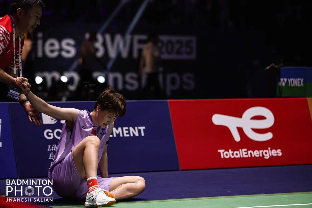 之后的女单半决赛,陈雨菲与安洗瑩两位奥运冠军迎来第27次交手。首局陈雨菲以21比15先声夺人,但在第二局开局阶段却意外崴脚,痛苦倒地。赛会医生建议她不要继续比赛了,但陈雨菲斩钉截铁地表示:“我要坚持,我要再试一下。”